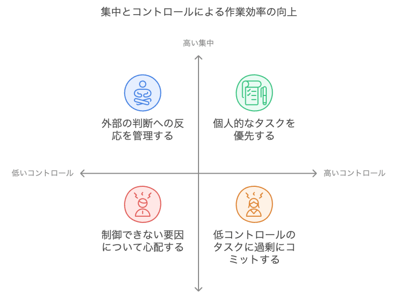 効率的な働き方を目指すためには、自分で影響を及ぼせる部分に意識を集中することが重要です。例えば、他人の判断や環境要因など、自分でコントロールできないことに気を取られるとストレスが増え、効率が下がります。「今、自分ができること」に意識を向ける習慣がワークエフィシェンシーを高めます。